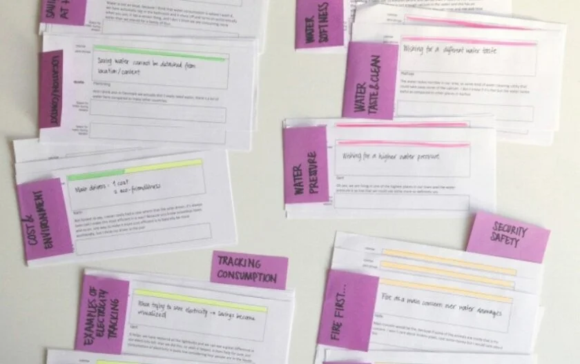 A careful analysis of all the data gathered throughout the generative sessions involved playing with findings throughout the wall to derive meaningful insights, themes and opportunity areas. Using cards containing relevant quotes and written interpretations facilitated the synthesis process by making it easier to draw connections.